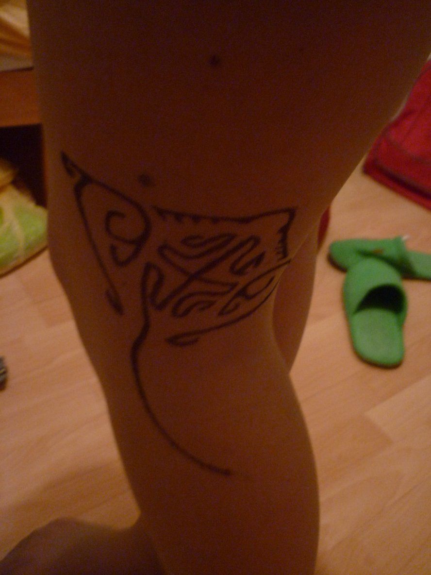 Dessin sur collant: le principe est simple, dans un collant, j'enfile une bouteille qui a la taille de l'endroit ou vas être le dessin (ex: mollet) je glisse le modèle en dessous et avec un feutre noir indélébile (j'utilise un feutre à calligraphie rempli d'encre de chine) et je dessine :D
